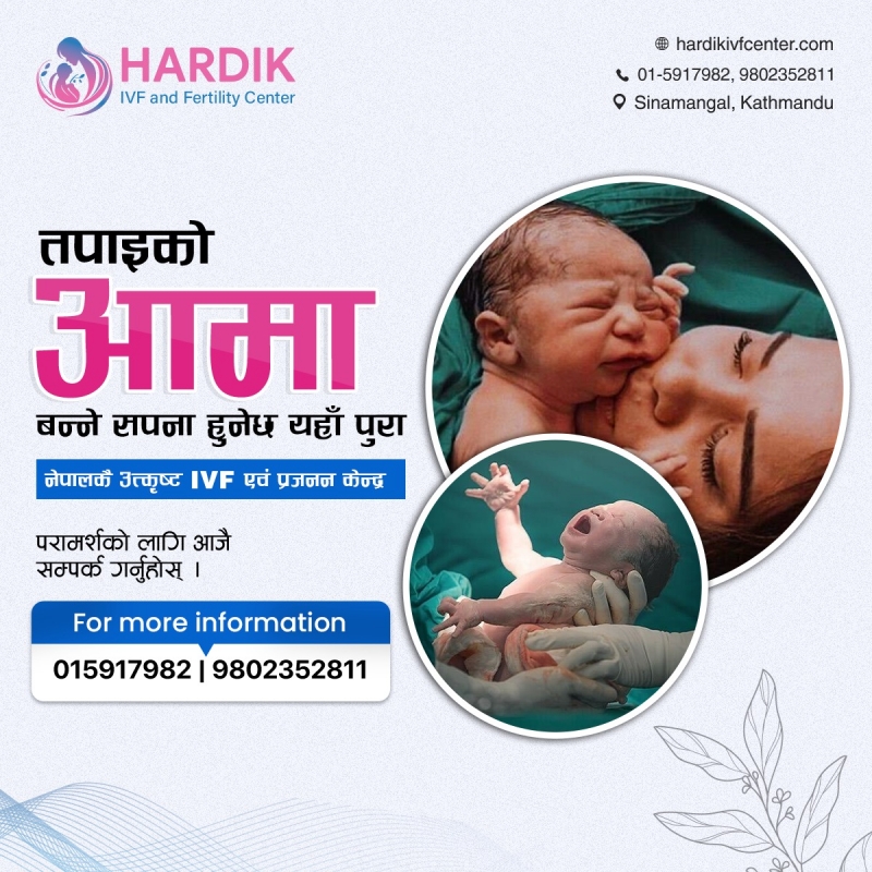 Hardik IVF and Fertility Center is a trusted fertility center located in Sinamangal, Kathmandu, Nepal. We are a dedicated team of professional doctors committed to turning your parenthood dreams into reality using advanced reproductive technology. At Hardik IVF, we offer an extensive range of services including In-vitro Fertilization (IVF), Intracytoplasmic Sperm Injection (ICSI), Intrauterine insemination (IUI), Intracytoplasmic Morphologically Selected Sperm Injection (IMSI), Ovulation Induction, Laser-Assisted Hatching, Egg freezing, Semen Freezing and Preimplantation Genetic Testing (PGT). Additionally, our experts recognize the emotional challenges of the fertility journey and provide personalized mental health counselling to guide you through the emotional aspects of infertility. Our mission is to empower parenthood journeys through our personalized and top-notch fertility care. Connect with us today as we are ready to fulfill your parenthood dreams.