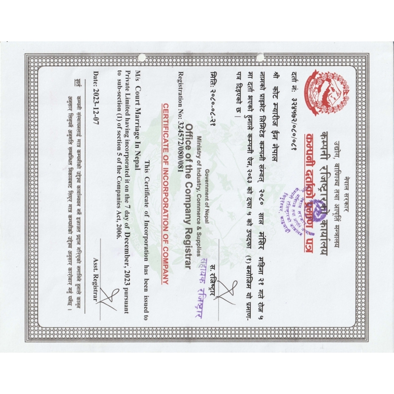 At Court Marriage in Nepal, we specialize in making your marriage process smooth, legal, and stress-free. With over 7 years of experience, our expert team handles everything—from document preparation to court registration—ensuring a seamless experience for both local and international couples. We offer personalized support, legal guidance, and full assistance every step of the way. Whether you're planning a simple court marriage or need help with foreign registration, accommodation, or legal counseling, we’re here to help. Trust us to make your special day fast, smooth, and unforgettable.